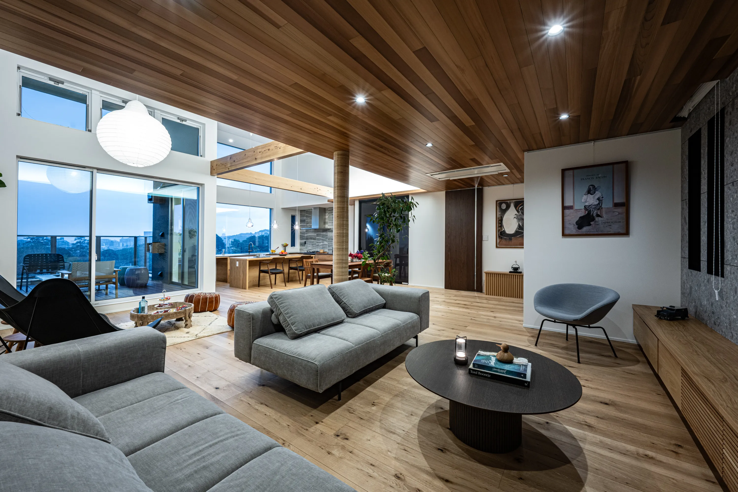 39.5帖の広さがあるL.D.K.は勾配天井で、最高天井高さは4.3m程あり、そこにあるハイサイドライトから空に視線が伸びてゆきます。